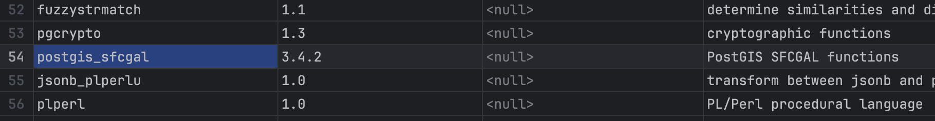 현재 사용 가능한 extension을 조회해보면 정상적으로 설치된 postgis 익스텐션을 확인할 수 있다.